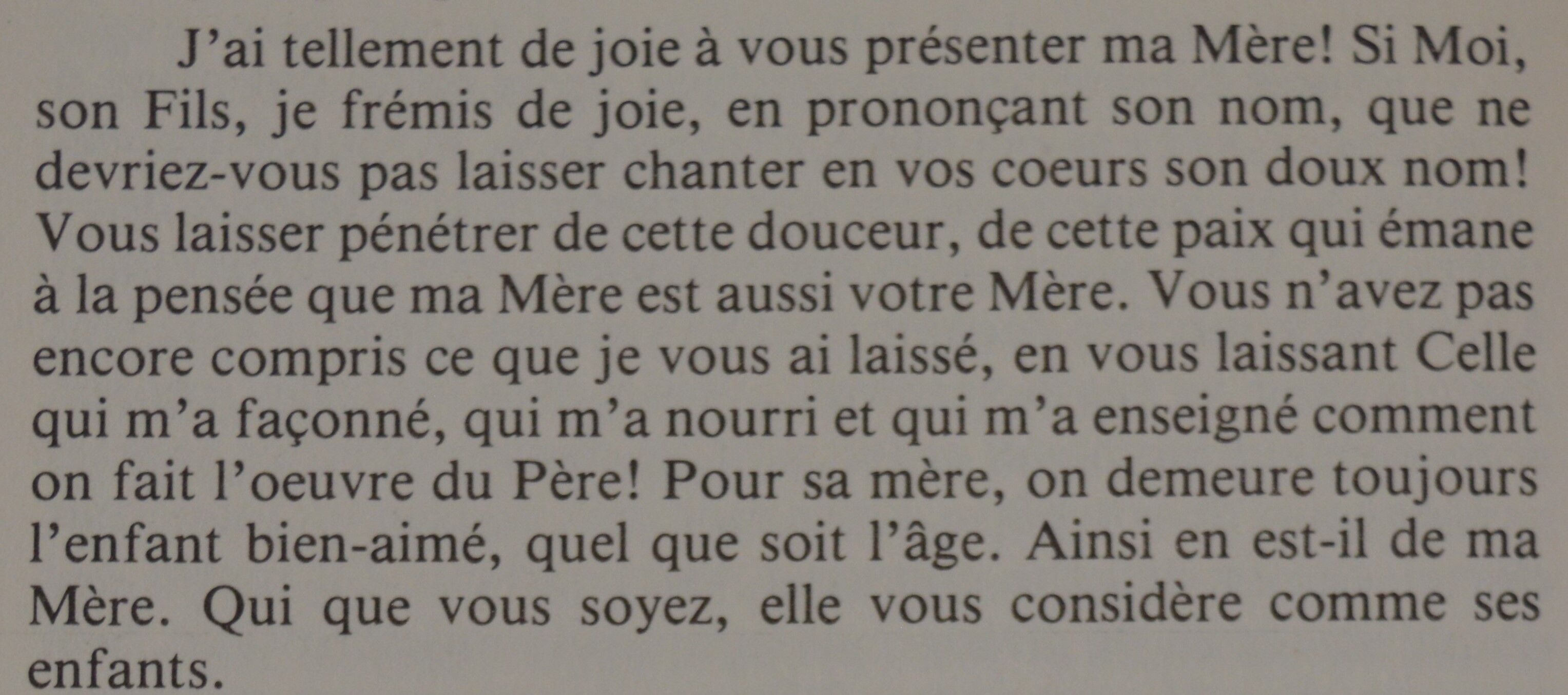 « Alors, ce soir, laissons-nous inspirer par Marie. Cette fidélité de tous les instants à la volonté de Dieu a fait d’elle une femme unique aux yeux de Dieu et aux yeux de l’Église également. Et, grâce à elle et à son exemple et surtout, grâce à Dieu, nos vies peuvent être uniques, précieuses, dans la mesure où elles sont en réponse à Dieu et à sa volonté. Amen. »