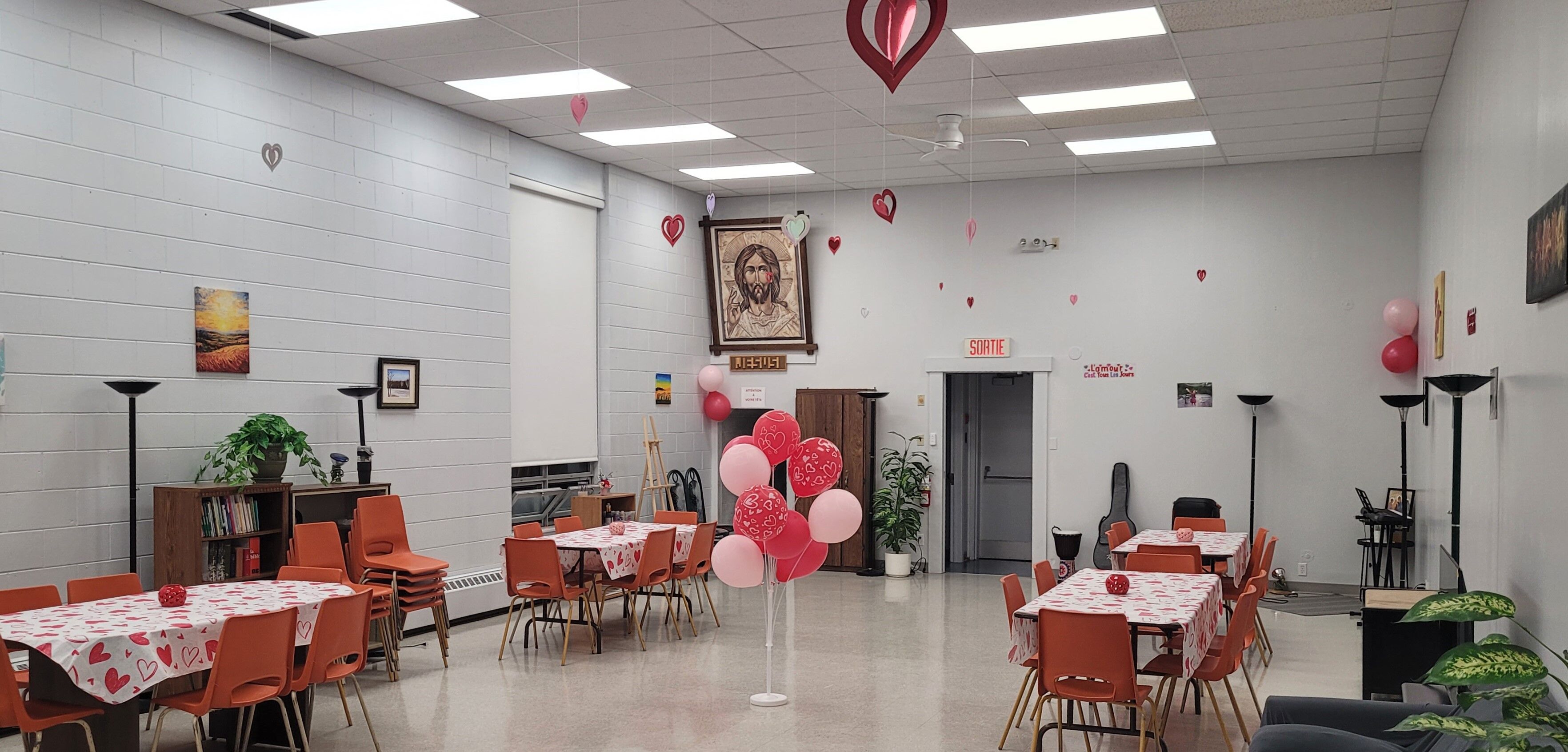 L'ancien local du Centre biblique Kerygma a été réaménagé pour sa nouvelle vocation, comprenant maintenant des partitions pour un salon, des tables et même un petit local de recueillement et de prière. Lors de la soirée d'inauguration, Mgr Guy Boulanger a fait mention que le lancement de la salle se fait dans la foulée du déménagement de l'évêché vers le centre-ville afin d'être localisé plus près de la population. « L'Église, c'est plus que la prière, la célébration et la catéchèse. D'abord, c'est l'Église qui se veut présente dans le monde, au service du monde, avec nos moyens qui sont modestes, cependant. Alors, le projet que l'on lance ce soir s'adresse autant aux jeunes, aux nouveaux arrivants, à des personnes seules, à des personnes qui sont parfois plus démunies. Comme Église, nous voulons aussi être plus solidaires avec d'autres organismes qui prennent soin, qui accueillent, qui soutiennent divers segments de notre communauté. »