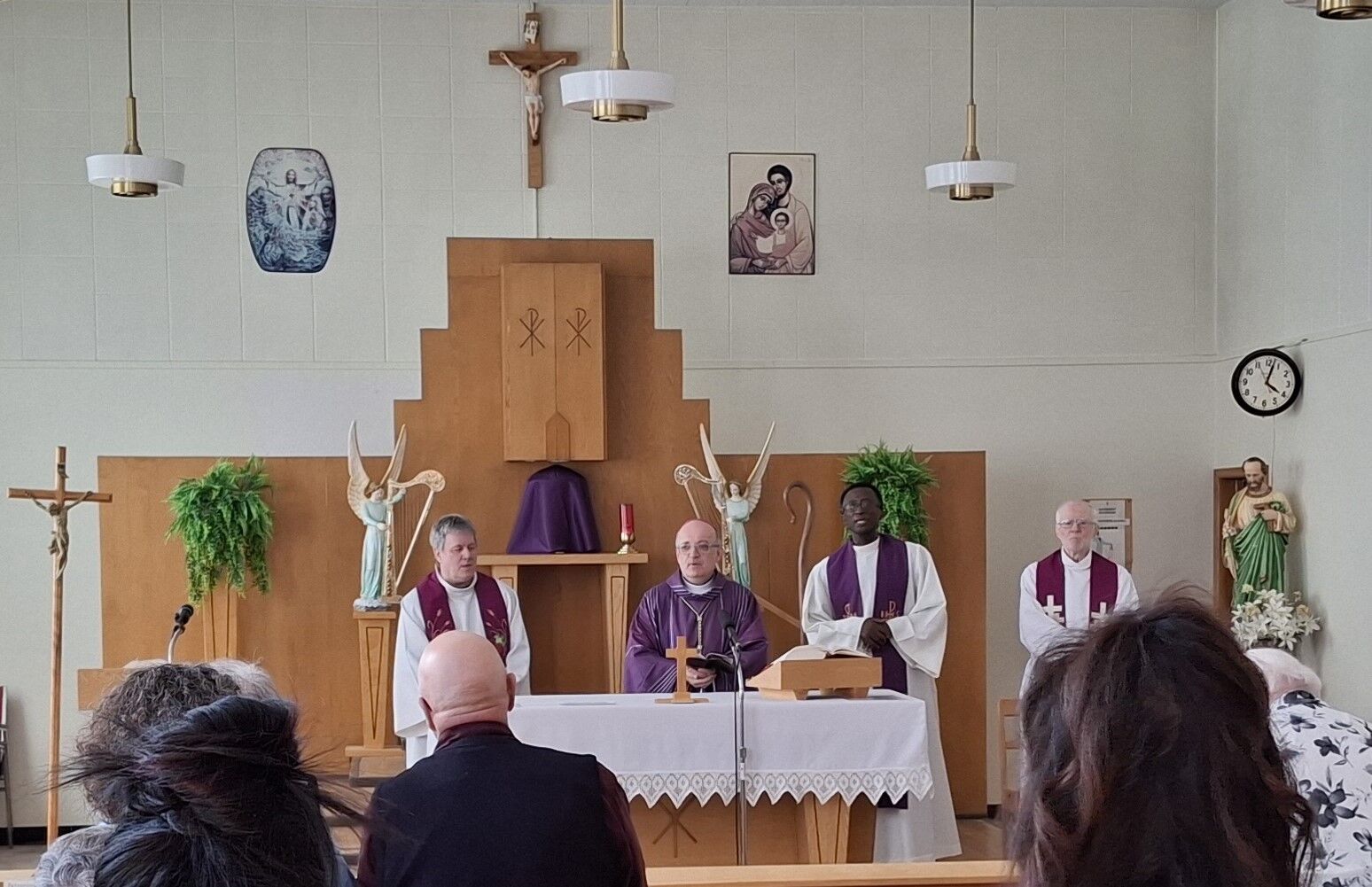 On Saturday, August 9th 2025, Blessed Sacrament Parish was the host of the pastoral visit by Bishop Guy Boulanger, as part of his pastoral visit to the two parishes of urban Rouyn-Noranda. By a nice coincidence, attendance at the celebration was increased by the presence of a group of tourists (teenagers and their chaperones) from southern Ontario, several families as well as local parishioners. After mass, a social exchange took place at the back of the church and the event continued with a good meal at Mike's Restaurant. A big thank you to the organizers, to the participants (and Father Prosper Kuakasa cp, co-celebrant) as well as, of course, to Bishop Boulanger.